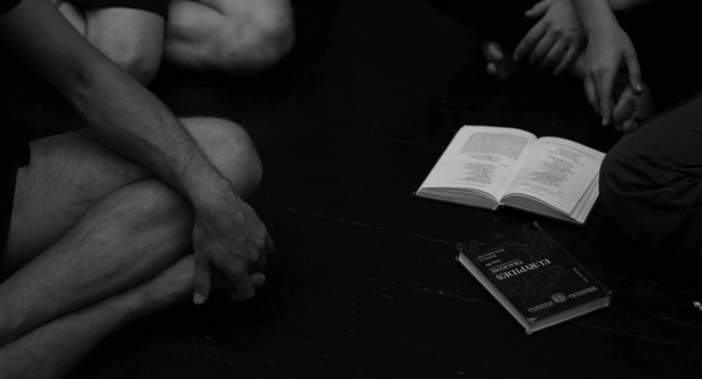 Materiał dla naszych poszukiwań stanowią tragedie Eurypidesa i zawarte w nich partytury aktorskie. Poddane analizie pod kątem kolejności pojawiania się wstępujących na scenę postaci, ukazują szczególną regularność, którą określamy jako Zasada Trzech Aktorów . Jej funkcję w postrzeganiu i rozumieniu antycznego spektaklu można porównać do roli, jaką pełnią zasady dynamiki Newtona w mechanice klasycznej. Dzięki jej zastosowaniu w pracy nad źródłami, szczególnie zaś w praktyce scenicznej, możemy dostrzec niezwykle misterny system zachowania energii, jak również podtrzymania jej nieustannego krążenia wewnątrz organizmu, jakim jest spektakl.