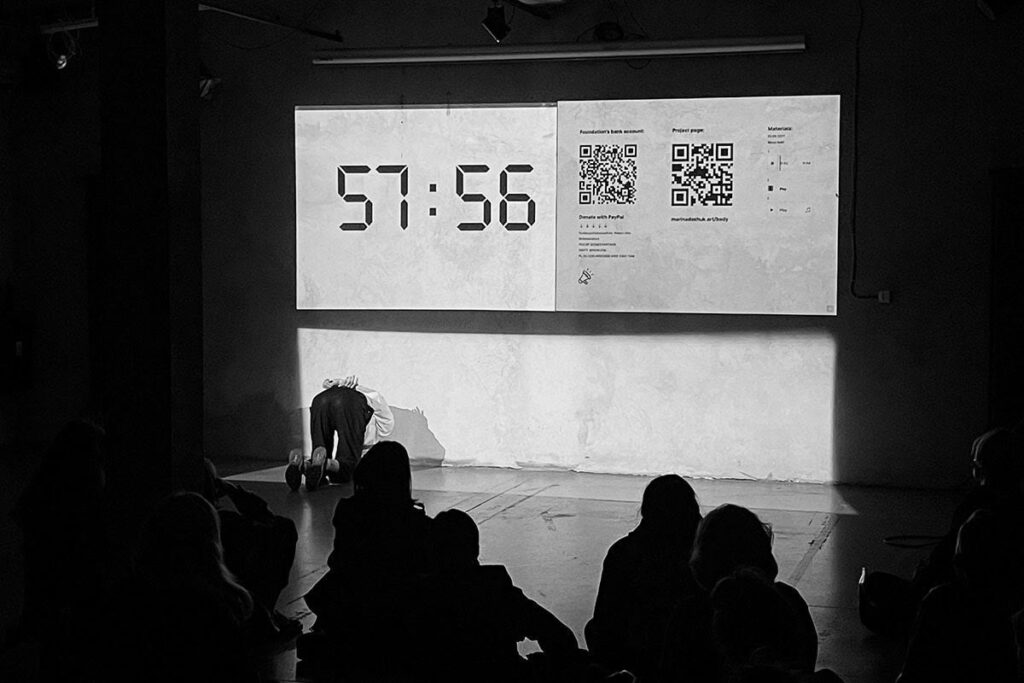 Pomysł na performance zrodził się ze stanu protestu przeciwko przemocy, przeciwstawiania się długotrwałemu stresowi i strachowi oraz próby przezwyciężenia poczucia winy, w którym świadomie lub nie, żyją dziś Białorusini. Jest to rodzaj zaproszenia do wyobrażenia sobie bycia zatrzymanym w Białorusi, do fizycznego przejścia przez bezprawie, nielegalność i oburzenie, przez które przeszły dziesiątki tysięcy osób cywilnych – to przemoc, która trwa do dziś. Performer buduje prosty sposób komunikacji z publicznością: utożsamiając się z zatrzymanym, symuluje…