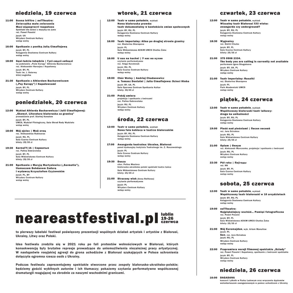 Podczas festiwalu zobaczymy także spektakle stworzone przez zespoły białorusko-ukraińsko-polskie w ramach rezydencji artystycznych Instytutu Teatralnego im. Z. Raszewskiego. Będziemy gościć wybitnych autorów i ich tłumaczy. Pokażemy czytania performatywne współczesnej dramaturgii, reagującej na zbrodnie za naszymi wschodnimi granicami. Finałowym wydarzeniem będzie koncert plenerowy w Parku Ludowym, podczas którego podziękujemy kilkuset wolontariuszom zaangażowanym w pomoc uchodźcom.
