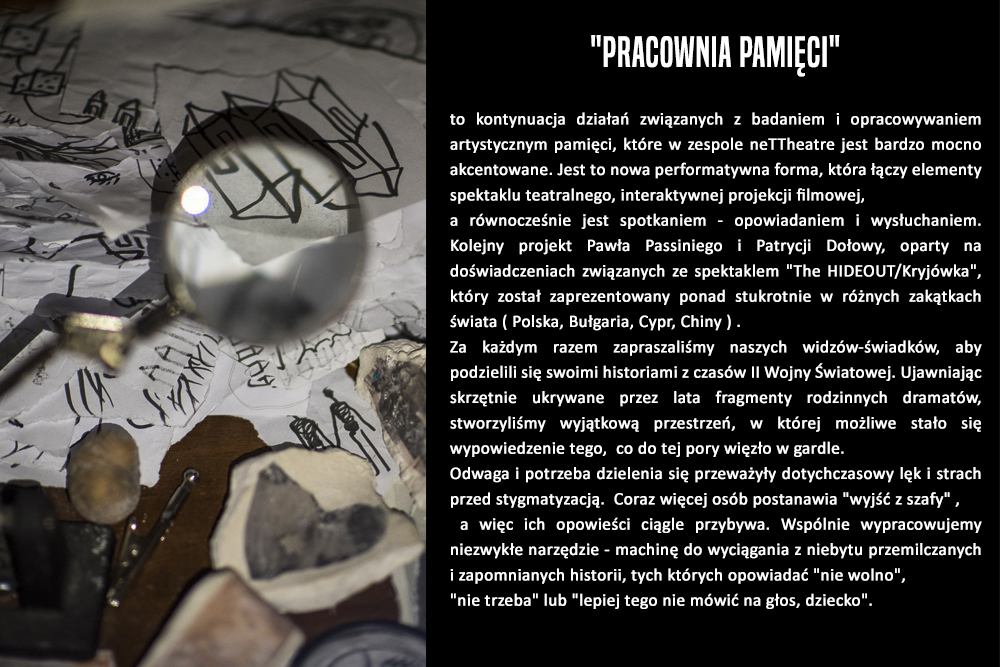 Indywidualne świadectwa wojenne m. in. Ireny Solskiej i Apolonii Starzec składają się na opowieść o Warszawie – jej złożonej, splecionej z wieloma losami historii i wielowątkowej, często trudnej i nie do końca obecnej pamięci. „The HIDEOUT/ KRYJÓWKAto historia osobista, spektakl, który podróżuje, pracownia pamięci, spotkanie. Aby ujawnić kryjówkę, należy do niej wejść, do wewnątrz, i wtedy znajdujemy się blisko.A z nami plątanina włóczki oraz:Irena Solska – wielka polska aktorka…